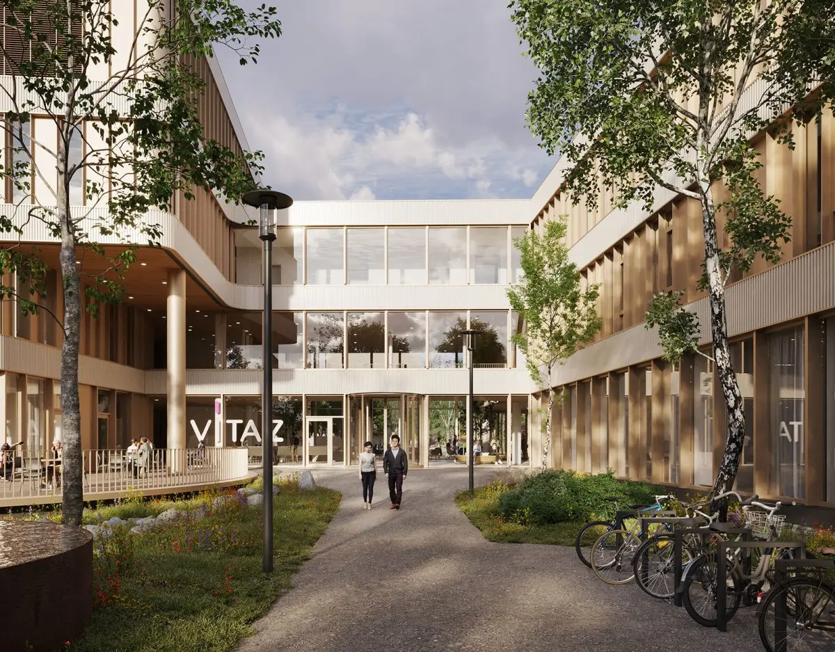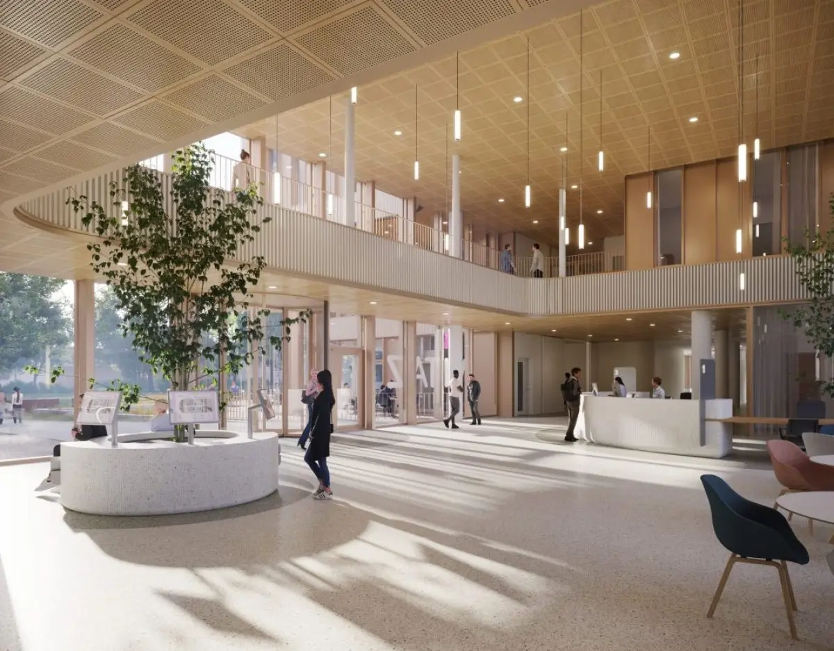 De campus AZ Lokeren wordt groen en uitnodigend. Drie bouwblokken huisvesten de ziekenhuisfuncties, verbonden door een centrale zone die transparant blijft. Groene stroken met beplanting en waterbassins tussen de blokken zorgen voor zichtlijnen door en vanuit het gebouw.