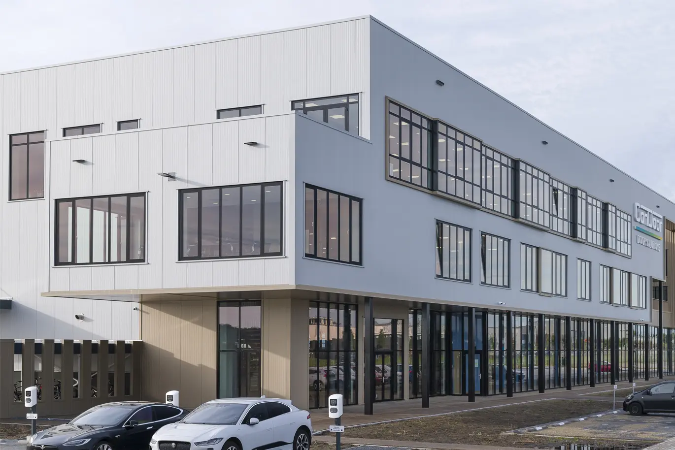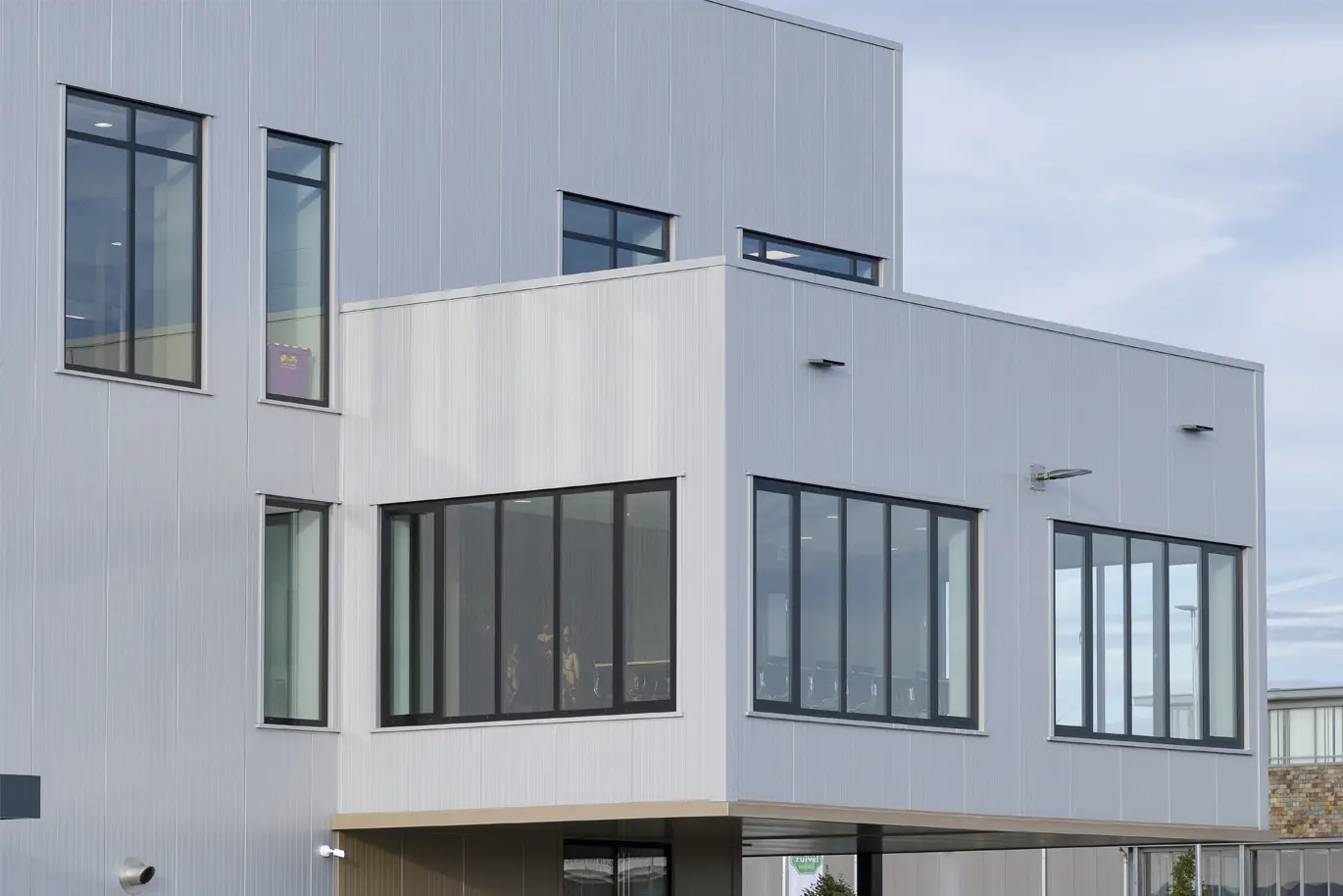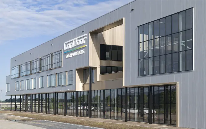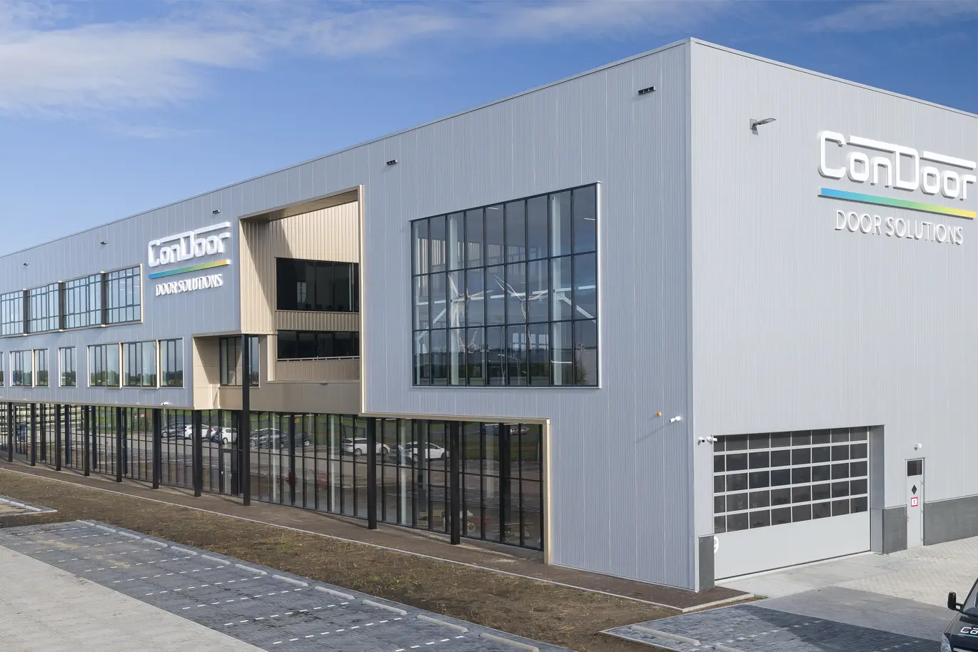 Als nieuwe visitekaartje kan dit gebouw van ConDoor Door Solutions wel tellen en daaraan draagt de opvallende voorkant zeker bij. Zo kragen de twee verdiepingen met kantoorruimtes uit boven de plint en tekende de architect een gevel met ramen die hier en daar wat in diepte verspringen en zo voor een extra dimensie zorgen. Ook het dakterras, als het ware een patio midden in de gevel, springt meteen in het oog. In die voorgevel werden veel en grote raampartijen geïntegreerd. Die zorgen voor de nodige transparantie en lichtinval, waardoor de medewerkers van ConDoor Door Solutions dagelijks naar een wel zeer aangename werkomgeving trekken. Vierboer Aluminium Kozijnen uit Swifterbant leverde en monteerde de raam- en vliesgevelsystemen.