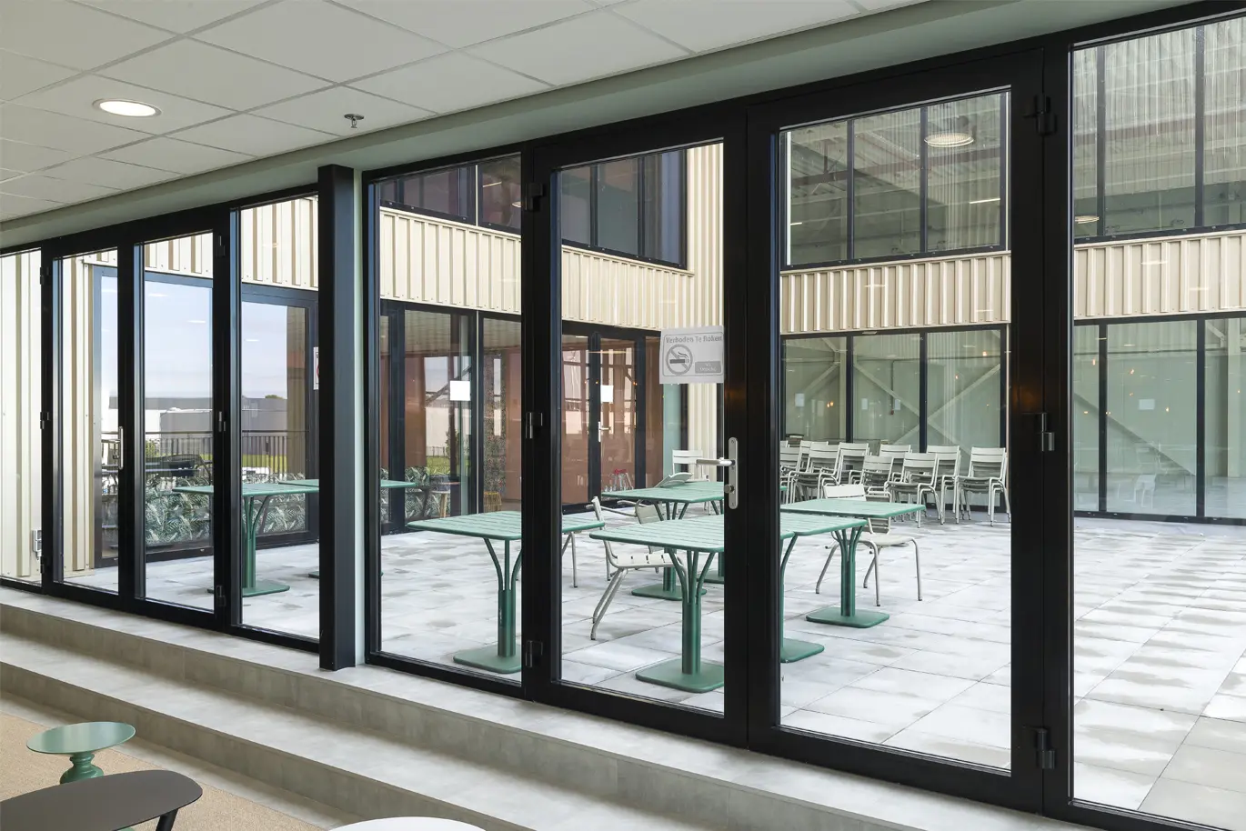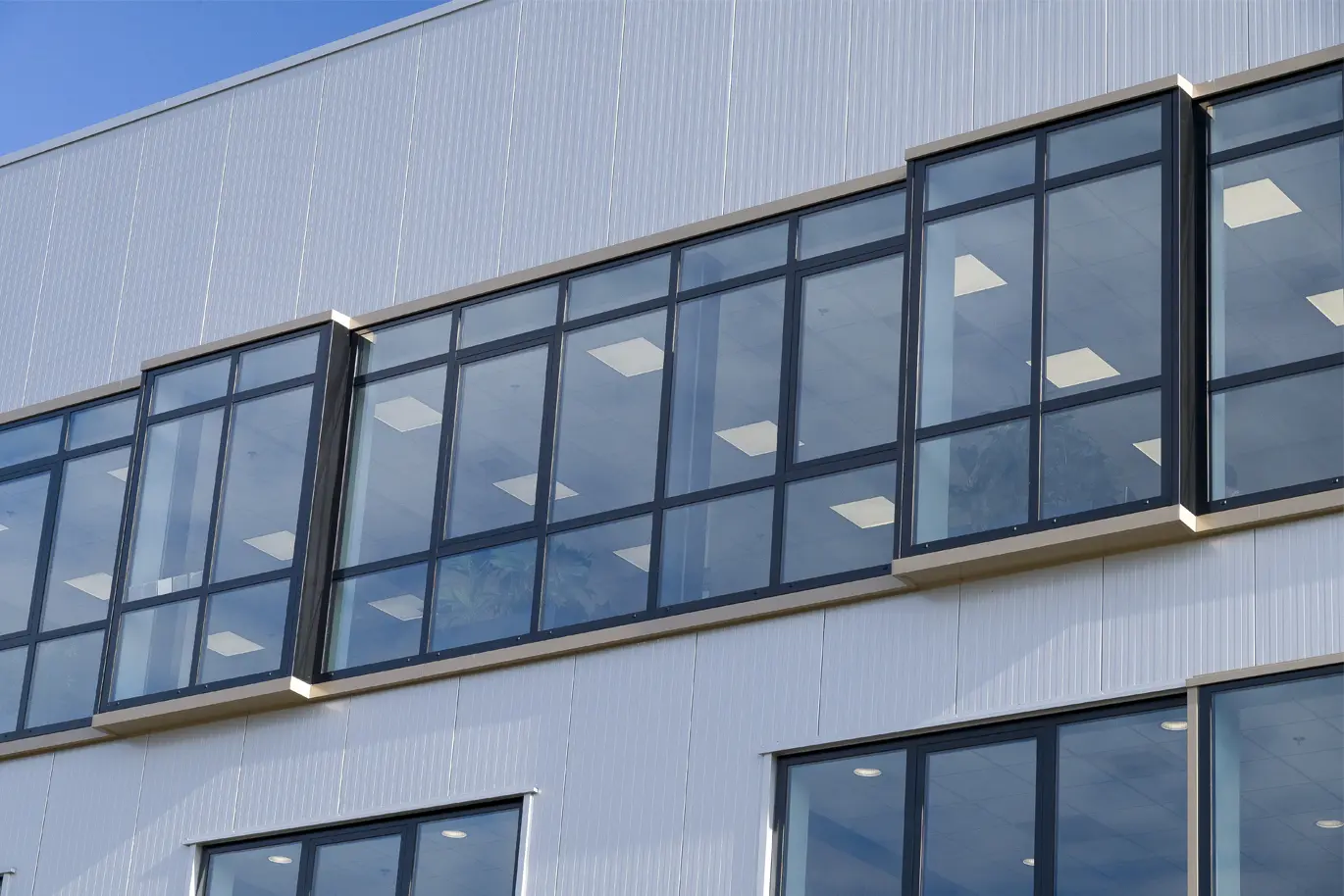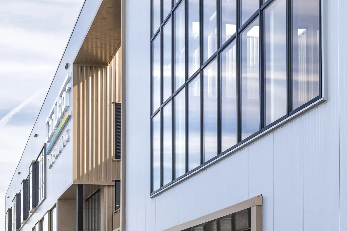 Als nieuwe visitekaartje kan dit gebouw van ConDoor Door Solutions wel tellen en daaraan draagt de opvallende voorkant zeker bij. Zo kragen de twee verdiepingen met kantoorruimtes uit boven de plint en tekende de architect een gevel met ramen die hier en daar wat in diepte verspringen en zo voor een extra dimensie zorgen. Ook het dakterras, als het ware een patio midden in de gevel, springt meteen in het oog. In die voorgevel werden veel en grote raampartijen geïntegreerd. Die zorgen voor de nodige transparantie en lichtinval, waardoor de medewerkers van ConDoor Door Solutions dagelijks naar een wel zeer aangename werkomgeving trekken. Vierboer Aluminium Kozijnen uit Swifterbant leverde en monteerde de raam- en vliesgevelsystemen.