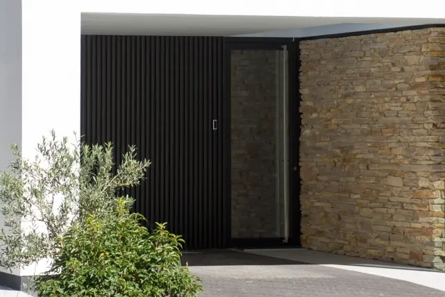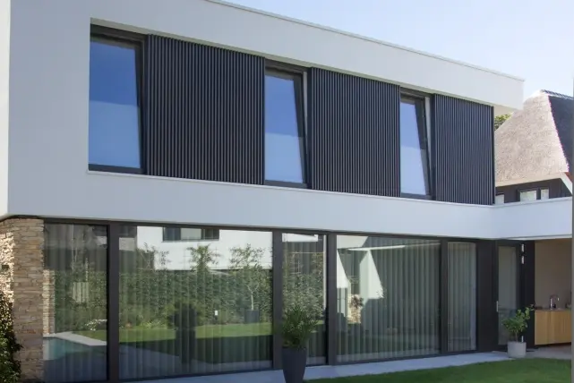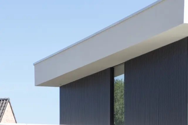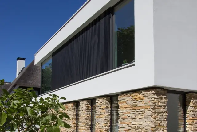 Voor deze prachtige woning in Ede, koos TVA architecten voor een combinatie van 3 gevelmaterialen: witte bepleistering en natuursteen in combinatie met de aluminium gevelbekleding Deco Wall. MKK BV uit Veldhoven – partner van Aliplast – plaatste de Deco Wall en koos voor het verticale opklikprofiel DW231 dat 40mm diep is. De donkere schaduwen tussen de profielen benadrukken de rechte lijnen in de gevelbekleding.