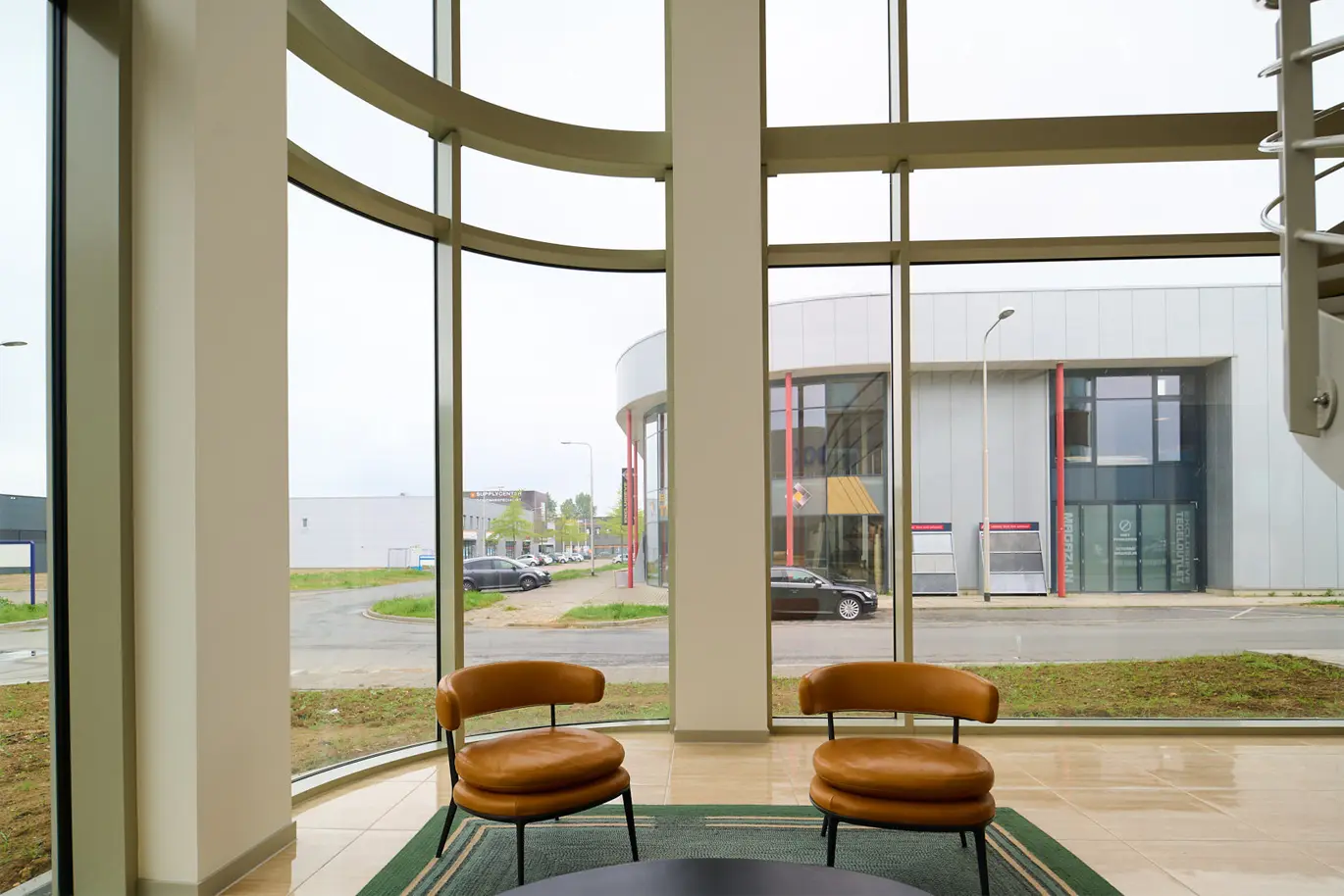 Er is gekozen voor de Aliplast MC Wall vliesgevel en de Star75 ramen en deuren. Architectenbureau DENC speelde met 2 dieptelagen en afgeronde hoeken, en laat gebogen profielen nu net één van onze specialiteiten zijn.