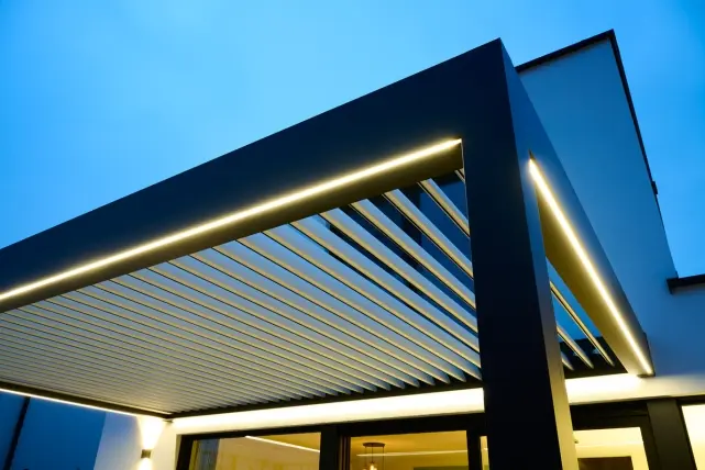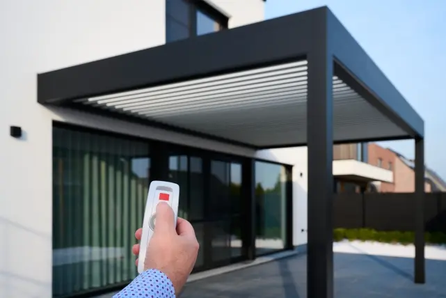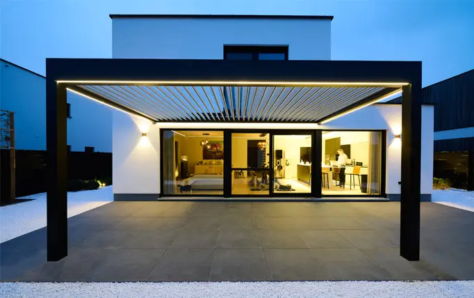 De lamellen kan geopend of gesloten worden met de afstandsbediening. De LED-verlichting maakt er een supergezellige terrasoverkapping van.