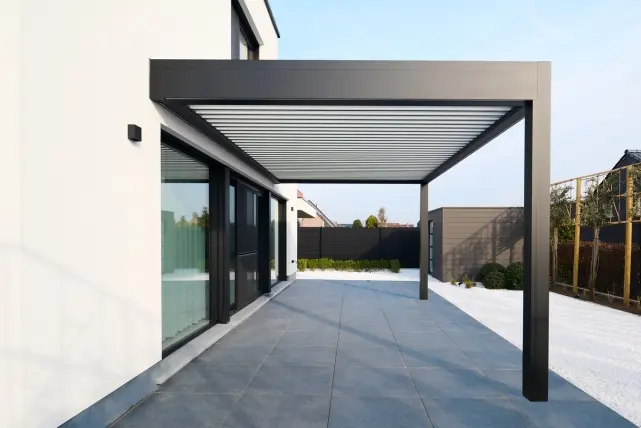 Dit grote lamellendak werd aangebouwd aan een witte villa en geeft een strakke verlenging van de woning.