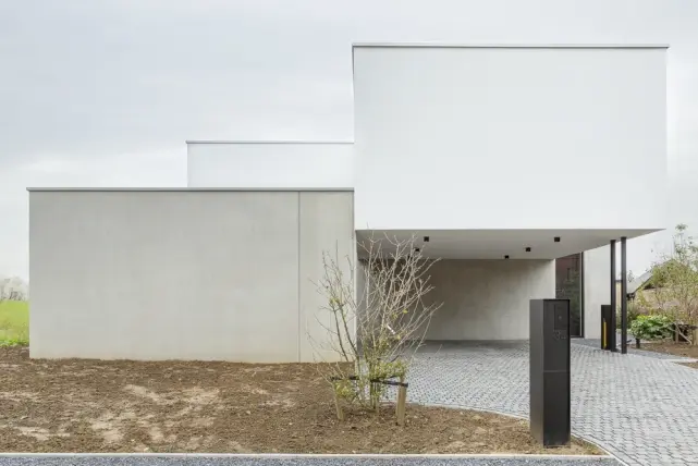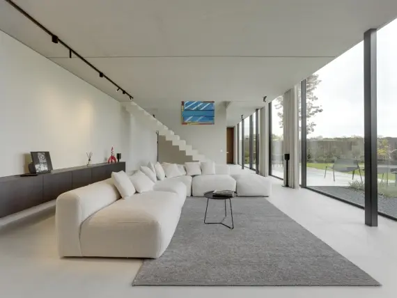 De woning combineert zichtbeton met witte gevelbezetting, wat zorgt voor een harmonieus evenwicht tussen privacy en openheid. Binnen wordt de woning echter volledig verbonden met de buitenwereld door middel van grote glaspartijen, die een naadloze interactie met de natuurlijke omgeving mogelijk maken.