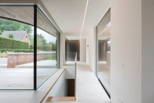 Voor de schuiframen werd met de Ultraglide gewerkt, het meest performate en isolerende profiel uit het Aliplast gamma. De uitvoering is een monorail om zoveel mogelijk glas te zien en zo weinig mogelijk profiel. In combinatie met de driedubbele beglazing krijg je een goede isolatie én een mooi eindresultaat.