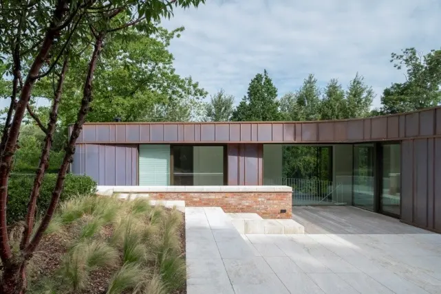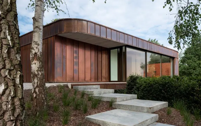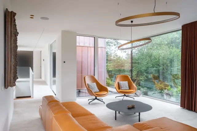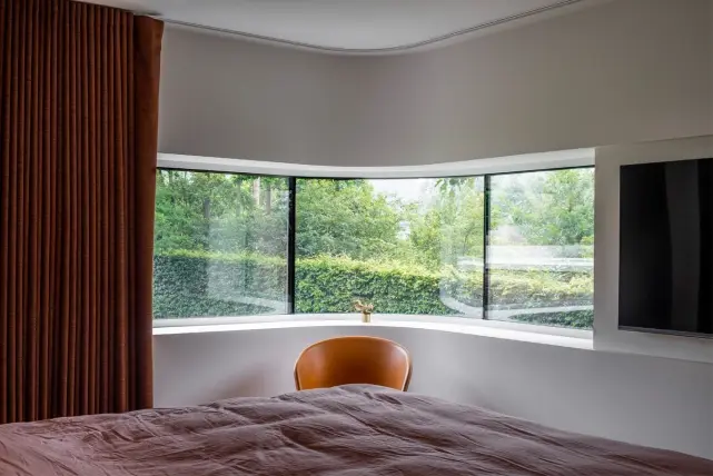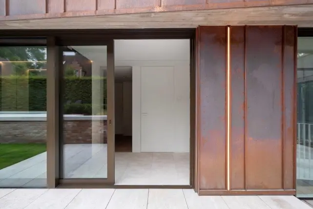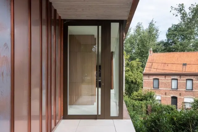 Voor de villa met gebogen vormen en koperen gevel, werd gekozen voor de Star75 omdat dit een moderne en strakke uitstraling heeft. De raamprofielen werden in 2 kleuren gelakt : de witte kleur 9010M van de ramen aan de binnenkant gaat zo op in de witte muren en versterkt de grote ruimtes. Voor de buitenkant koos men poederkleur 8C33AN, dat is een bronzen lakanodisatie, als alternatief in poedervorm voor de echte kleuranodisatie. Zo geniet de eigenaar van een kleurgarantie van 15 jaar.
