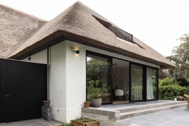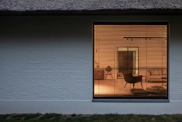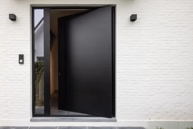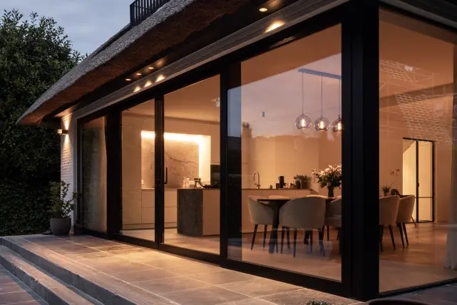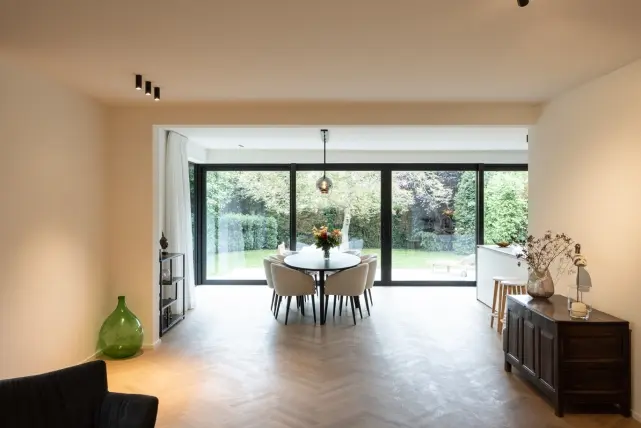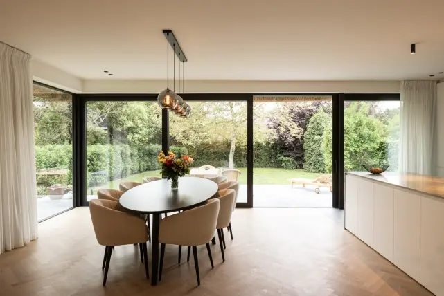 Voor deze prachtige villa koos onze partner EVC voor een Ultraglide schuifraam duorail. Hierbij hebben de profielen van kader en vleugel dezelfde hoogte. De vlakke dorpel zorgt voor een mooie overgang tussen binnen en buiten. De XL pivoterende voordeur is een fantastische binnenkomer. Deze deur in profiel Star90 met vlak opdekpaneel heeft een smalle uitsparing die dienst doet als design greep.