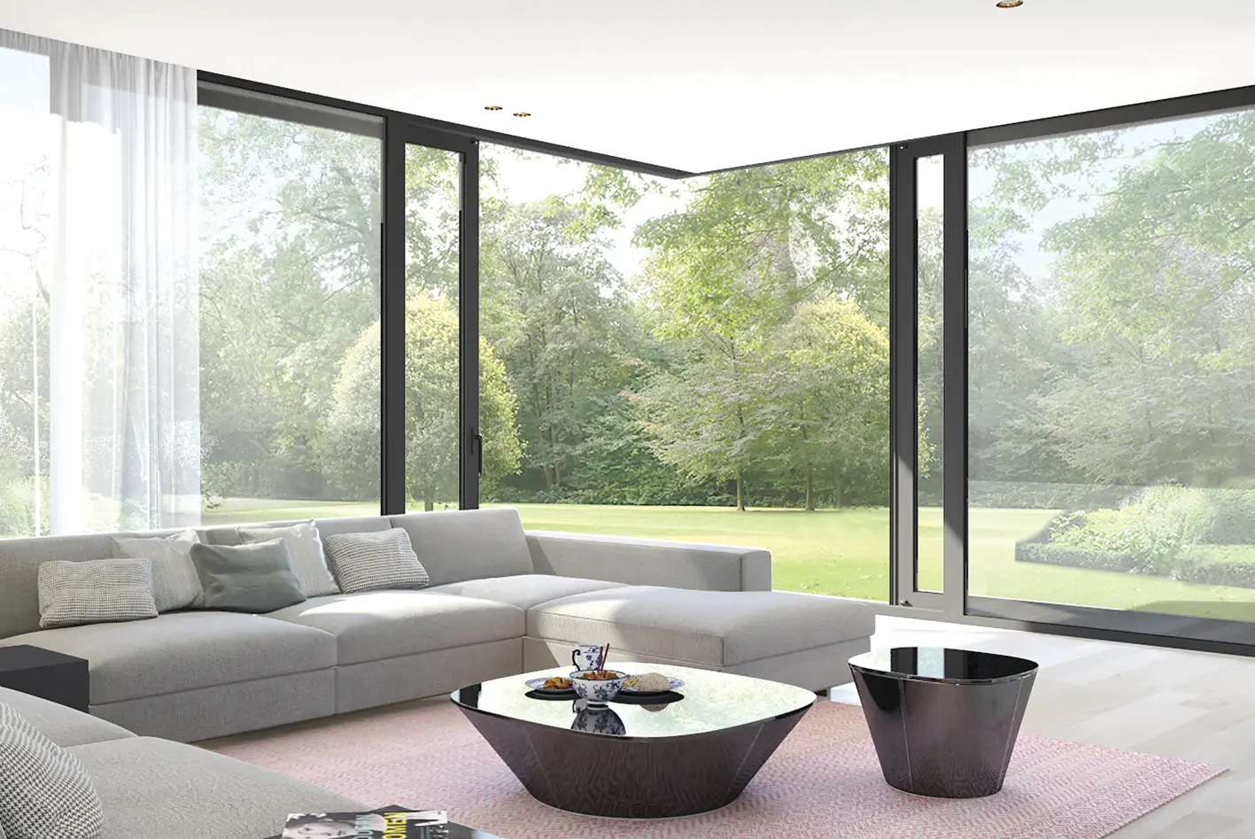 Je kan ook kiezen voor een slank schuifraam in een open hoek van 90°, zonder profielstijl op de hoek. Zo kan je maximaal genieten van een binnen-buitengevoel. Dankzij een hefschuifsysteem kan je het raam gemakkelijk openen.
