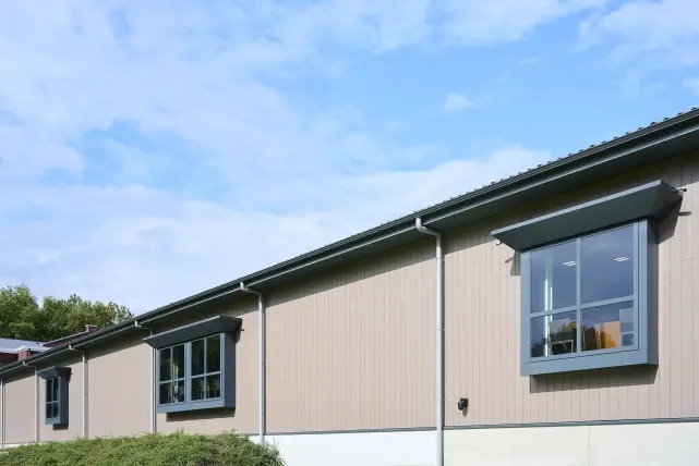Ein entscheidender Vorteil im Projektverlauf war die vollständig integrierte Fertigungskette von Aliplast. Durch die hauseigene Biegeabteilung konnten auch die anspruchsvollen geschwungenen Fensterelemente für das Eingangsgebäude präzise umgesetzt werden. Sämtliche Profile wurden in Anthrazitgrau (RAL 7016) mit einer