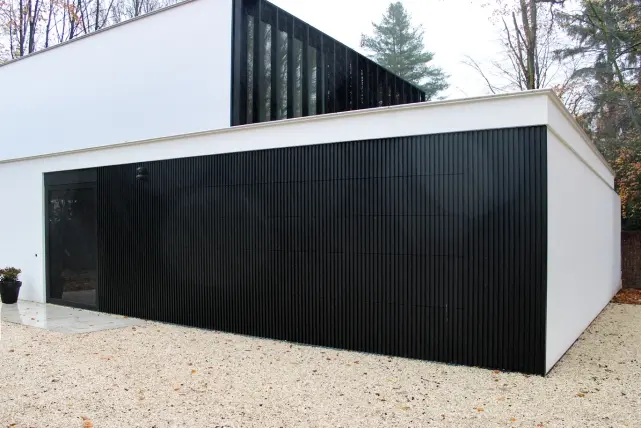 Der erste Eindruck dieser modernen Villa wird durch die weiße Crepi-Fassade in Kombination mit dem klaren und modernen Design der Aluminiumverkleidung Deco Wall bestimmt. Das Unternehmen Aluvano aus Ledegem, ein Partner von Aliplast Aluminium Systems, ist von diesem System begeistert. "Diese Verkleidung gibt jedem Haus sofort das gewisse Extra. Und dank des Klicksystems ist es einfach zu montieren, sogar über einem Sektionaltor", sagt Eddy von Aluvano.