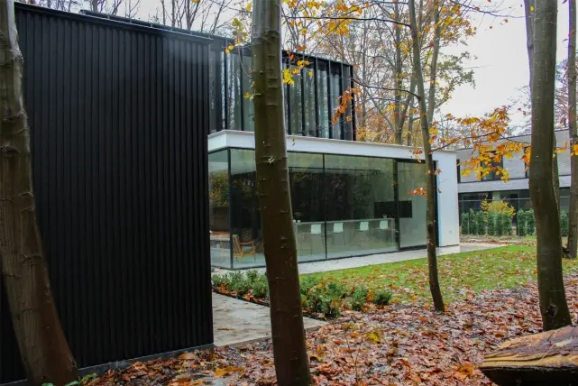 Zeitgenössische Pracht: Weiße Villa mit schwarzen Tischlerarbeiten in einem Waldgebiet