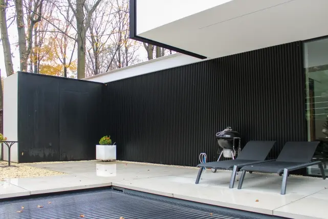 Jedes Element der Villa, von der Verkleidung bis zu den Fenstern, trägt zur Gesamtästhetik bei. Alle Aluminiumteile sind in der Farbe 9ST05D, einem tiefschwarzen Strukturlack, pulverbeschichtet. Diese Farbwahl verleiht dem Äußeren nicht nur einen Hauch von Eleganz, sondern bietet dem Aluminium auch einen jahrelangen Schutz.