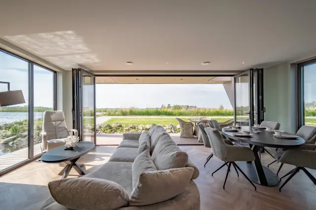 On the terrace side of the houses, the choice fell on the New Panorama from Aliplast. These folding walls offer unlimited panoramic views of the water. This system is characterized by its flexibility, with possibilities for 2 to 8 sections and glass thicknesses ranging from 9 to 50 mm. This solution has a built-in depth of 75 mm for the outer frame and sash and a view width between 15 and 58 mm for the frame and 73 mm for the sash.