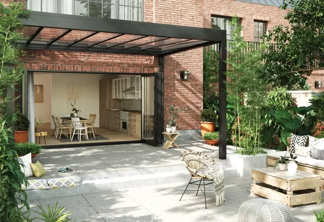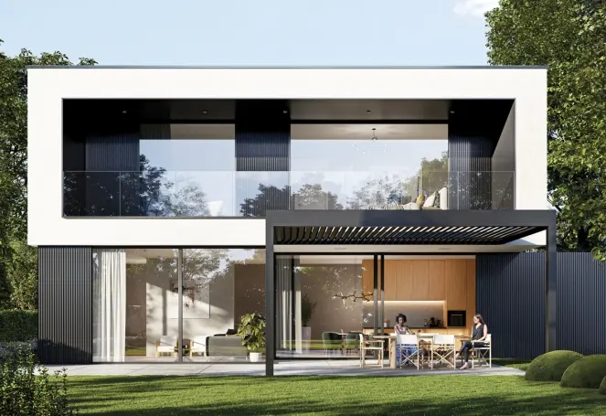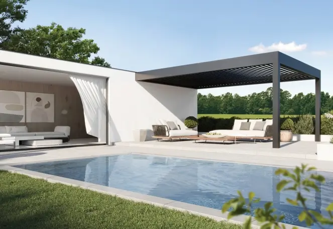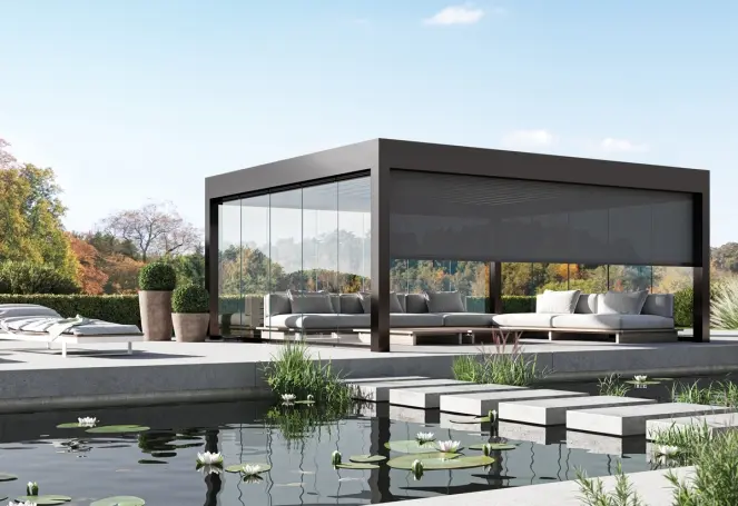 La pergola bioclimatique Somnium est un coup de cœur minimaliste et élégant pour votre jardin ou terrasse. Il peut être lié en longueur et en largeur. C’est possible aussi bien avec un toit en verre qu’avec un toit à lamelles.