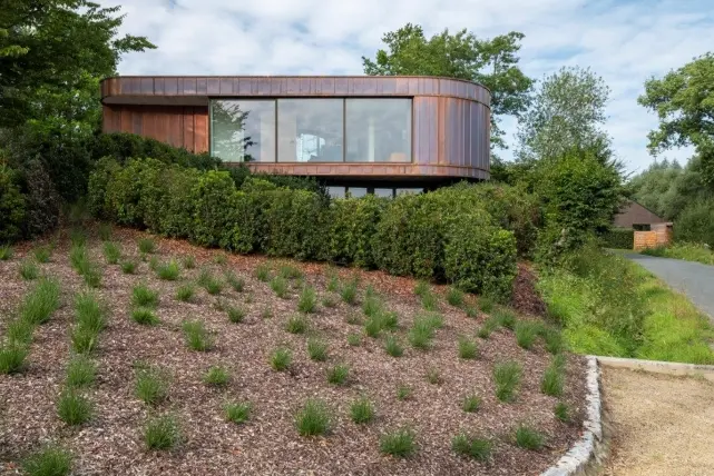 Om in de sfeer te komen… wat denk je van deze villa met gebogen vormen en koperen gevel? Hier werd gekozen voor de Star75 lijn omdat dit een moderne en strakke uitstraling heeft. De raamprofielen werden in 2 kleuren gelakt: de witte kleur 9010M van de ramen aan de binnenkant gaat zo op in de witte muren en versterkt de grote ruimtes. Voor de buitenkant koos men poederkleur 8C33AN. Dat is een koperkleurige lakanodisatie, als alternatief in poedervorm voor echte anodisatie. Mooi, toch!