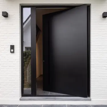 Een buitendeur met een strakke uitstraling waarbij de opendraaiende vleugel in glas kan zijn of een aluminium paneel of beiden.