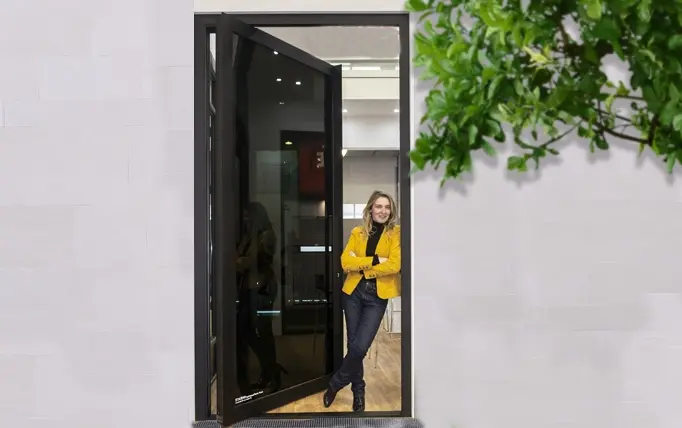 Bij Aliplast bestaat de pivoterende buitendeur in het Star90 systeem. De deur heeft een inbraakwerend meerpuntslot.